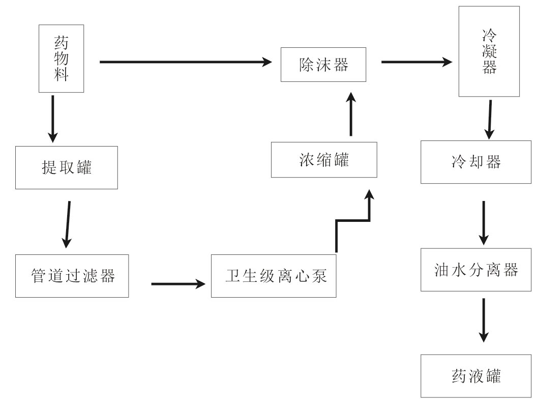 后至過濾器,進入濃縮器。濃縮時產生蒸汽進入冷凝器,成為冷凝液,作為新溶劑噴淋至提取罐同;提取罐內產生的二次蒸汽,經冷凝器冷