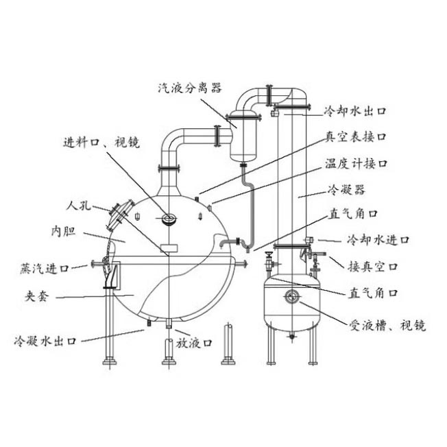 球形濃縮罐主要由濃縮罐主體、冷凝器、氣液分離器、受液桶四個部分組成,可用于制藥、食品、化工等行業對料液的濃縮、蒸溜及有機溶